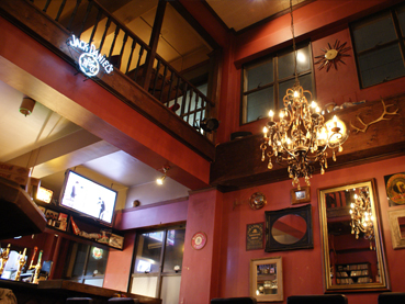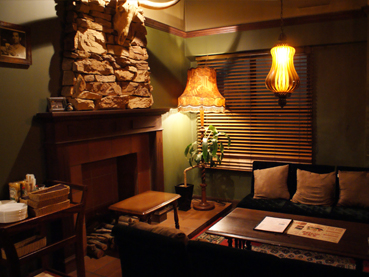そして暖炉のあるソファスペース。間接照明と暖炉の上のバッファロースカルがお洒落
